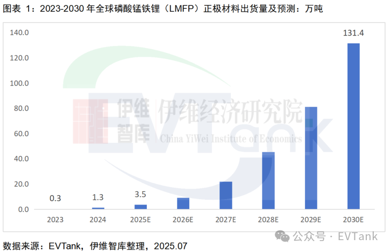 近日,研究机构EVTank联合伊维经济研究院共同发布了《中国磷酸锰铁锂(LMFP)材料行业发展白皮书(2025年)》。EVTank数据显示,2024年全球磷酸锰铁锂材料出货量为1.3万吨,2025年上半年其出货量已经超过去年全年,预计2025年全球磷酸锰铁锂材料出货量将达到3.5万吨。EVTank表示,相对于磷酸铁锂材料,磷酸锰铁锂具有能量密度高,低温性能优等特点,并且在循环性能和安全性能方面与与磷酸铁锂材料相当。而相对于三元材料,磷酸锰铁锂在循环性能、成本和高温性能等方面明显优于三元。