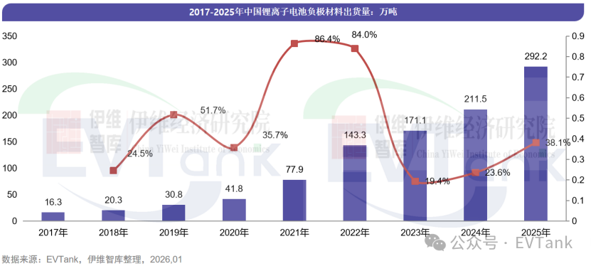 近日,研究机构EVTank联合伊维经济研究院共同发布了《中国锂离子电池负极材料行业发展白皮书(2026年)》。白皮书数据显示,2025年中国负极材料出货量达到292.2万吨,同比增长38.1%,增速相对于2024年提升14.5个百分点。从负极材料出货量结构来看,人造石墨负极材料出货量占比提升至86.9%达到254.0万吨。