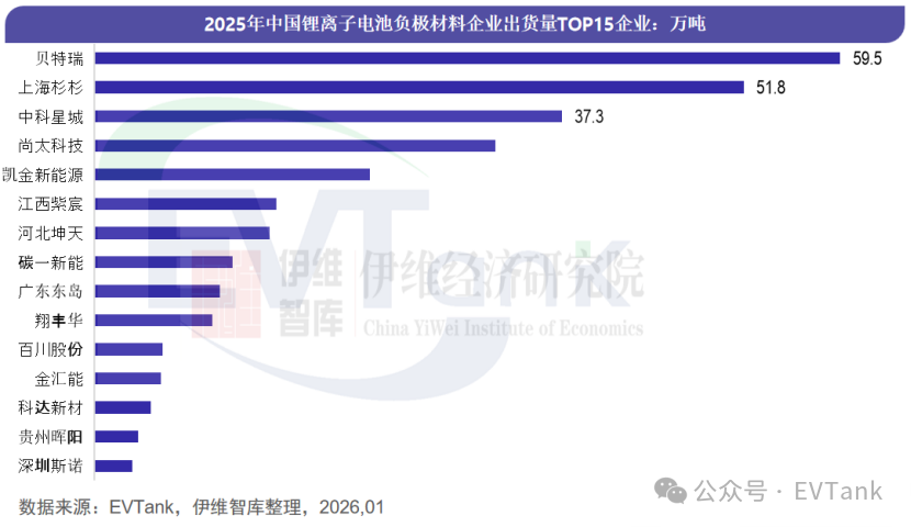 根据EVTank数据,2025年负极材料企业出货量排名前三的企业依然是贝特瑞、上海杉杉和中科星城,其全年出货量分别为59.5万吨、51.8万吨和37.3万吨,三家企业合计市场份额达到50.9%。2025年中国负极材料企业出货量排名靠前的企业还包括尚太科技、凯金新能源、江西紫宸、河北坤天、碳一新能、广东东岛、翔丰华、百川股份、金汇能、科达新材、贵州晖阳和深圳斯诺。其中百川股份以超过5万吨的出货量排名第十一,同比增幅高达165.8%。