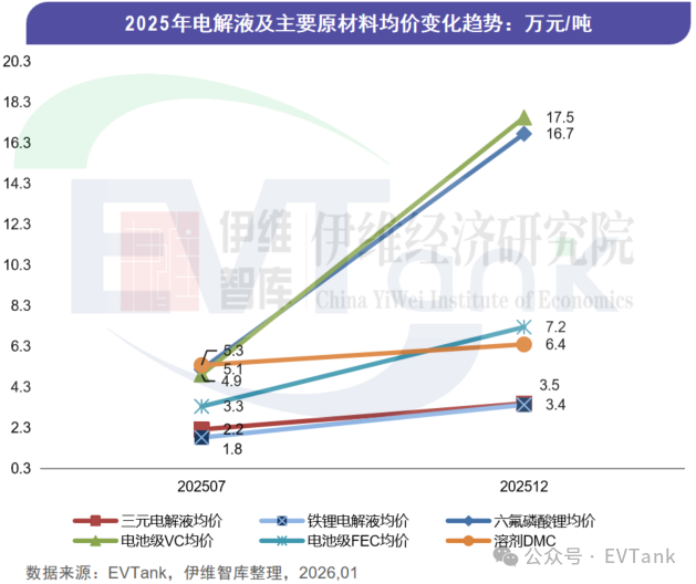 从市场规模来看,EVTank统计数据显示,2025年全球电解液市场规模为564.2亿元,同比增长37.6%,主要原因在于电解液出货量的大规模增长,价格相比2024趋于平稳,但是2025年下半年以来,由于电解液主要原材料六氟磷酸锂、溶剂和添加剂价格上涨,电解液价格在下半年也逐步开启涨价历程。EVTank统计数据显示,六氟磷酸锂由2025年7月的4.9万元/吨的均价涨到12月的16.7万元/吨的均价,VC也出现较大幅度的上涨。