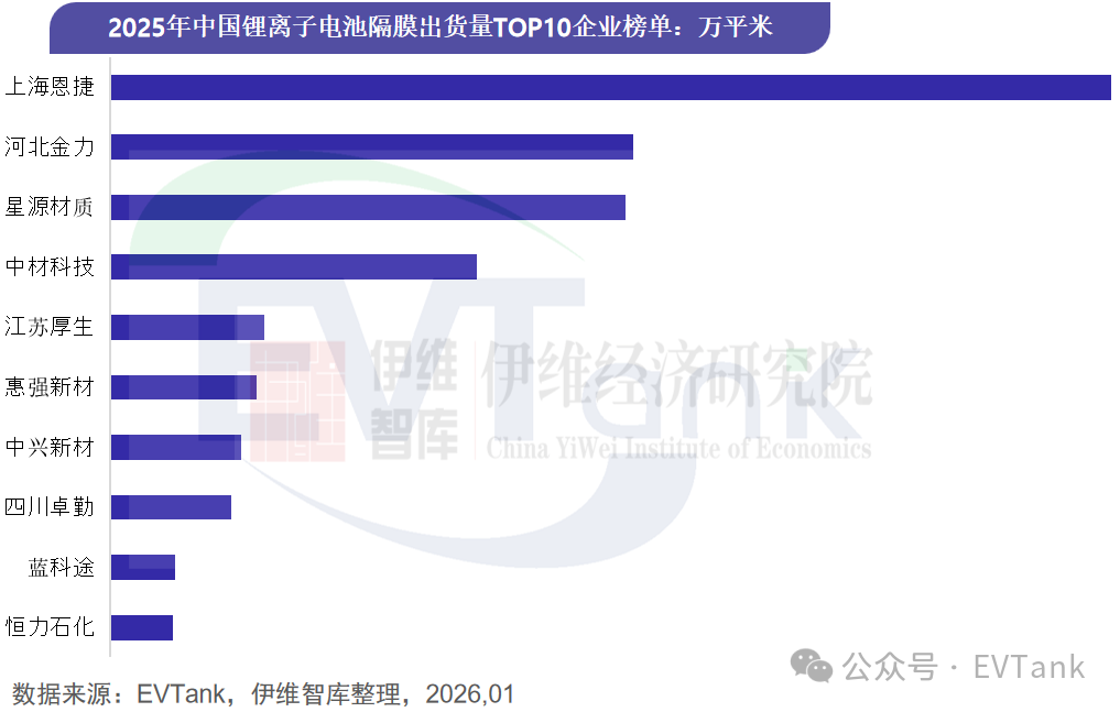 EVTank在白皮书中披露了2025年中国锂离子电池隔膜出货量TOP10企业名单,其中上海恩捷以接近100亿平米的出货量排名第一。进入中国TOP10的企业名单还包括:河北金力、星源材质、中材科技、江苏厚生、惠强新材、中兴新材、四川卓勤、蓝科途和恒力石化,其中恒力石化为2025年新上榜企业。更多内容可关注EVTank发布《中国锂离子电池隔膜行业发展白皮书(2026年)》EVTank:全球领先的专注于电动汽车及其相关产业链研究的权威第三方机构,为所有利益相关者、生产商、购买商、供应商、投资者、银行、政府提供独立而权威的专业研究服务。www.evtank.cn伊维经济研究院:在国家主管部门支持下依法设立的一家专注于新兴产业领域研究和咨询的第三方智库,研究院下设汽车产业研究中心、节能环保产业研究中心、电子信息产业研究中心、智能制造产业研究中心、新能源新材料产业研究中心等专业研究中心。研究院主要服务政府、企业和金融机构,提供产业规划、招商服务、市场调研、行业研究、企业管理咨询、投融资咨询、可行性研究等专业服务。研究院总部位于北京,在上海、深圳、重庆等地方设有分支机构。中国电池产业研究院:独立研究机构,总部位于北京,专注于新能源电池产业链的研究和咨询服务、大数据研发,致力于为客户提供权威、独立和专业的第三方行业研究报告和数据。【Email:service@evtank.cn;EVTank@163.com】