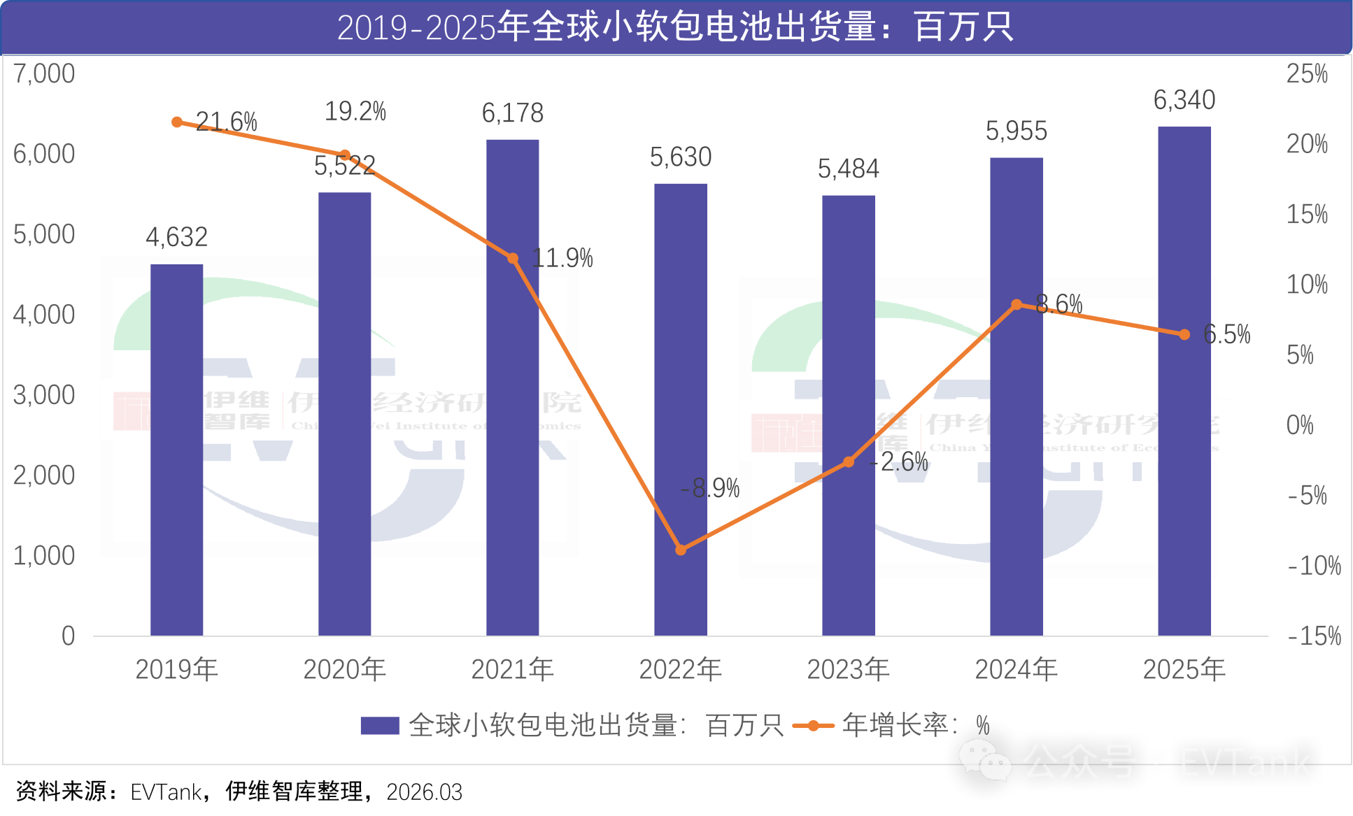 近日,研究机构EVTank联合伊维经济研究院共同发布了《中国小软包锂离子电池行业发展白皮书(2026年)》。白皮书数据显示,2025年全球小软包锂离子电池出货量达63.4亿只,同比增长6.5%。EVTank指出,2025年消费电子市场已整体进入成熟期,智能手机、笔记本电脑等传统3C领域仍占据需求主导地位,存量替换需求稳定,可穿戴设备、无人机、AR/VR及AI终端等新兴消费电子领域驱动行业新的增长点。