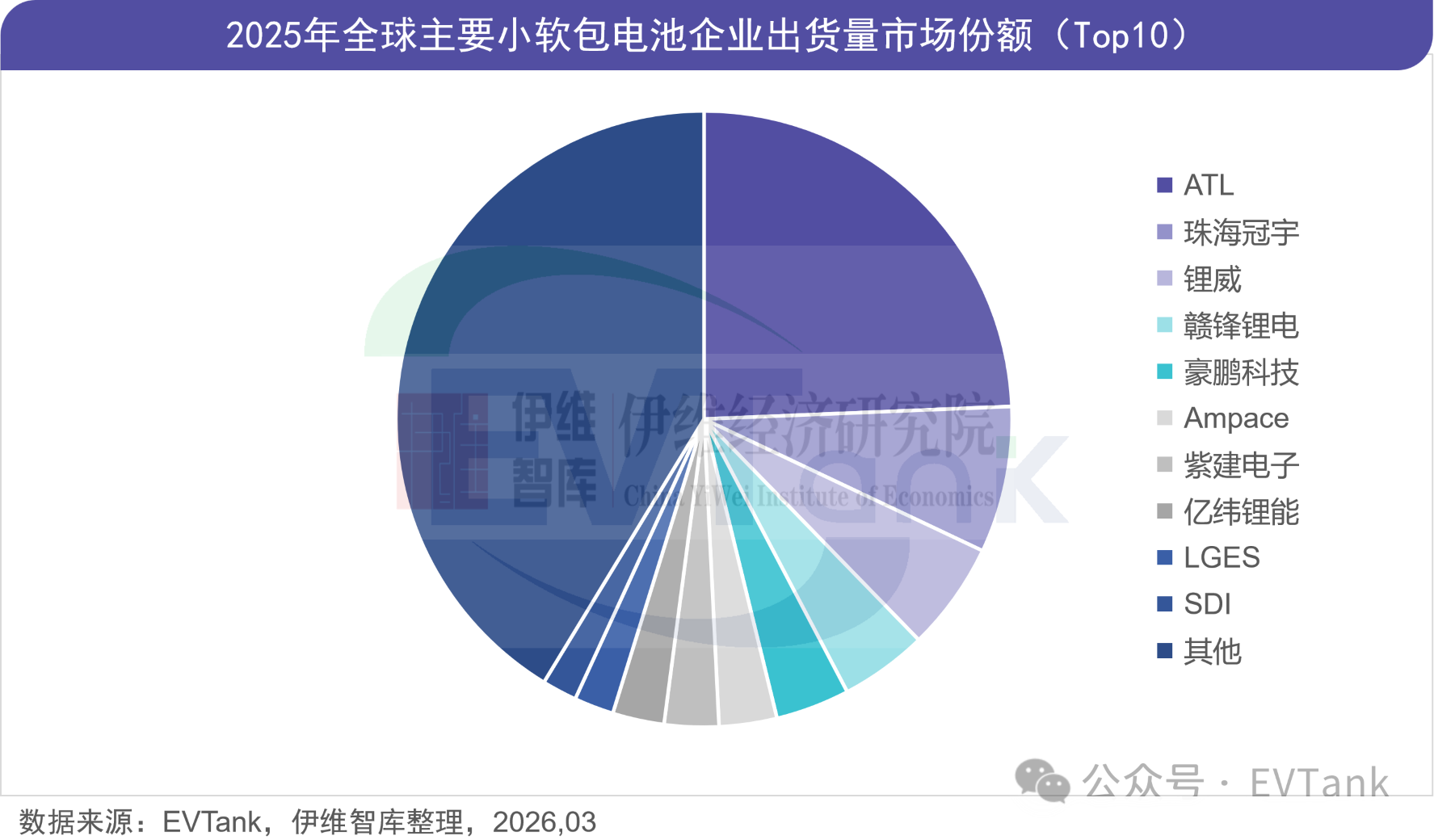 从竞争格局来看,EVTank发布的《中国小软包锂离子电池行业发展白皮书(2026年)》显示,ATL凭借其在智能手机、笔记本电脑和平板电脑等传统消费电子领域的优势,继续保持断层式领先,市场份额达到24.3%。珠海冠宇通过切入苹果手机电池供应链及在PC和无人机市场的供应占比提升,带动市场份额提升至7.7%。出货量排名全球前十的企业还包括锂威、赣锋锂电、豪鹏科技、Ampace、紫建电子、亿纬锂能、LGES和三星SDI。前十企业中有7家企业来自中国,日韩共3家企业,中国企业竞争力持续提升。