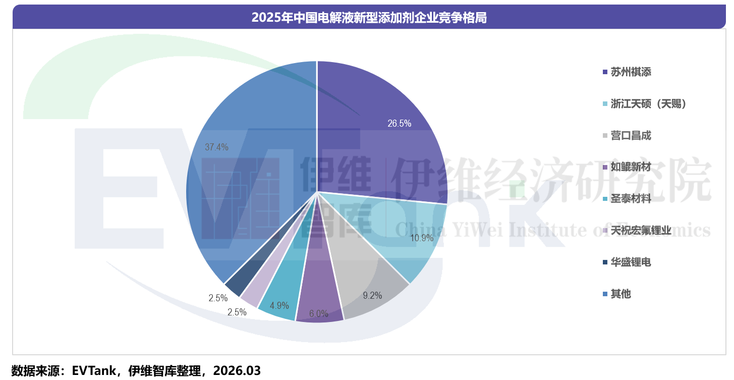 白皮书显示,从企业竞争格局而言,国内电解液企业以及常规添加剂龙头企业纵向和横向布局电解液新型添加剂领域,2025年行业前五大企业在中国新型添加剂市场份额合计为57.5%。